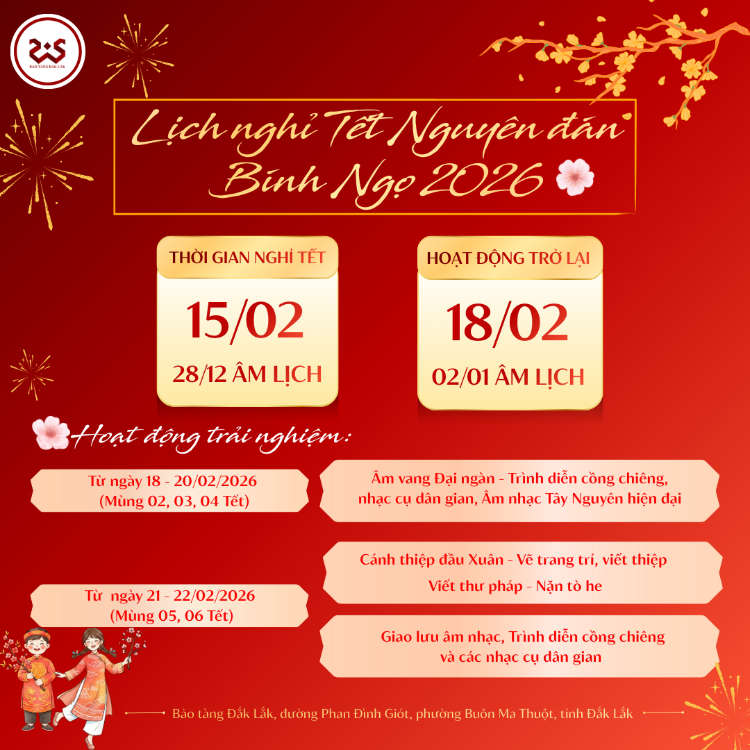 Bảo tàng Đắk Lắk trân trọng thông báo lịch nghỉ Tết Nguyên đán Bính Ngọ 2026